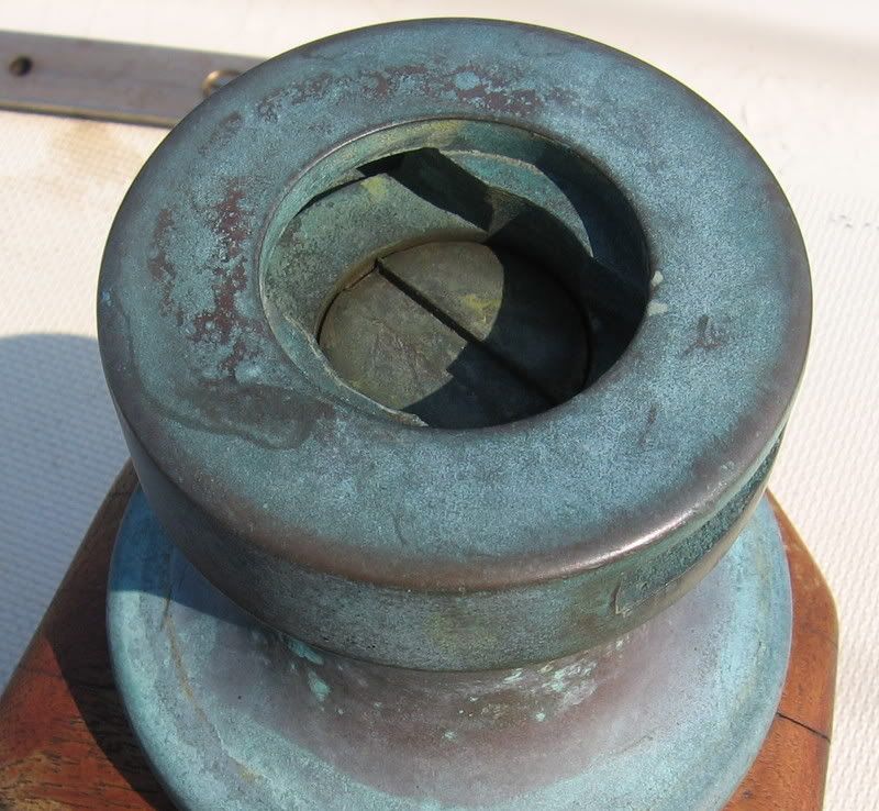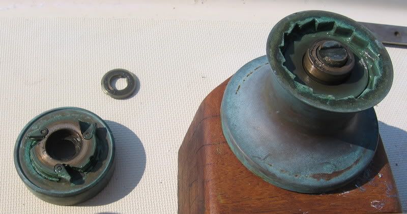 I think I broke the starboard side winch on Sunday. It was sticking a little and I gave it a good tug with the winch handle, when suddenly the top of the winch came off. Take a look at these pictures comparing the two winches and you’ll notice a circular crack in the starboard one. The bolt (nut? circlip?) which holds the top on has completely broken.